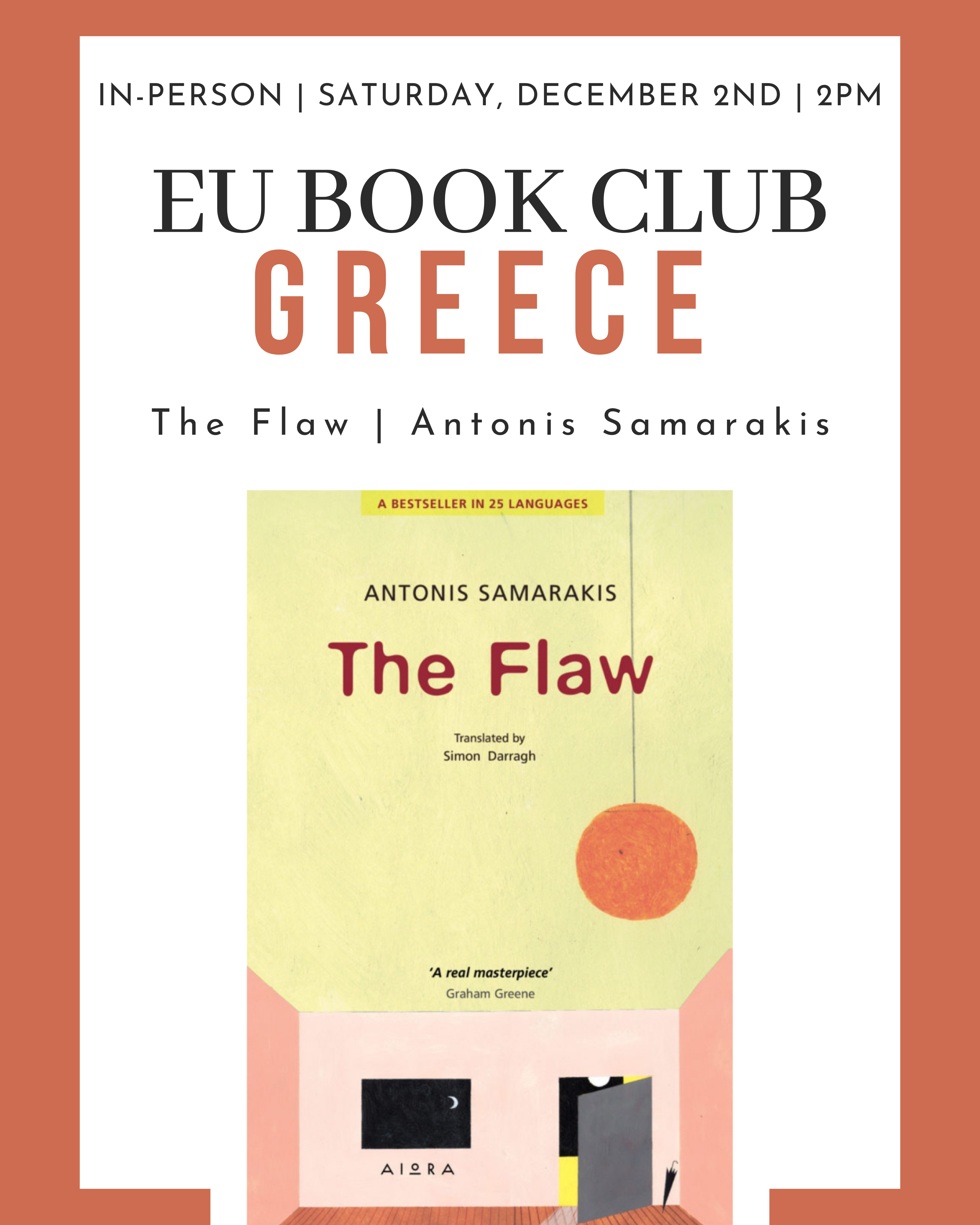 [EN] Organized by the Consulate General of Greece in Vancouver and EUNIC Canada-Vancouver, in collaboration with the Vancouver Public Library. In december, the EU Book Club will focus on "The Flaw" by Antonis Samarakis. Our book club will take place in person at the Hellenic Community Centre.