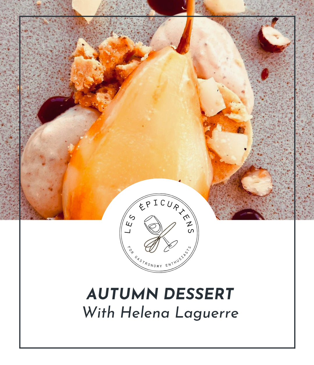 Helena, you’ll craft a harmonious layered dessert featuring: a soft hazelnut biscuit, a pear poached in