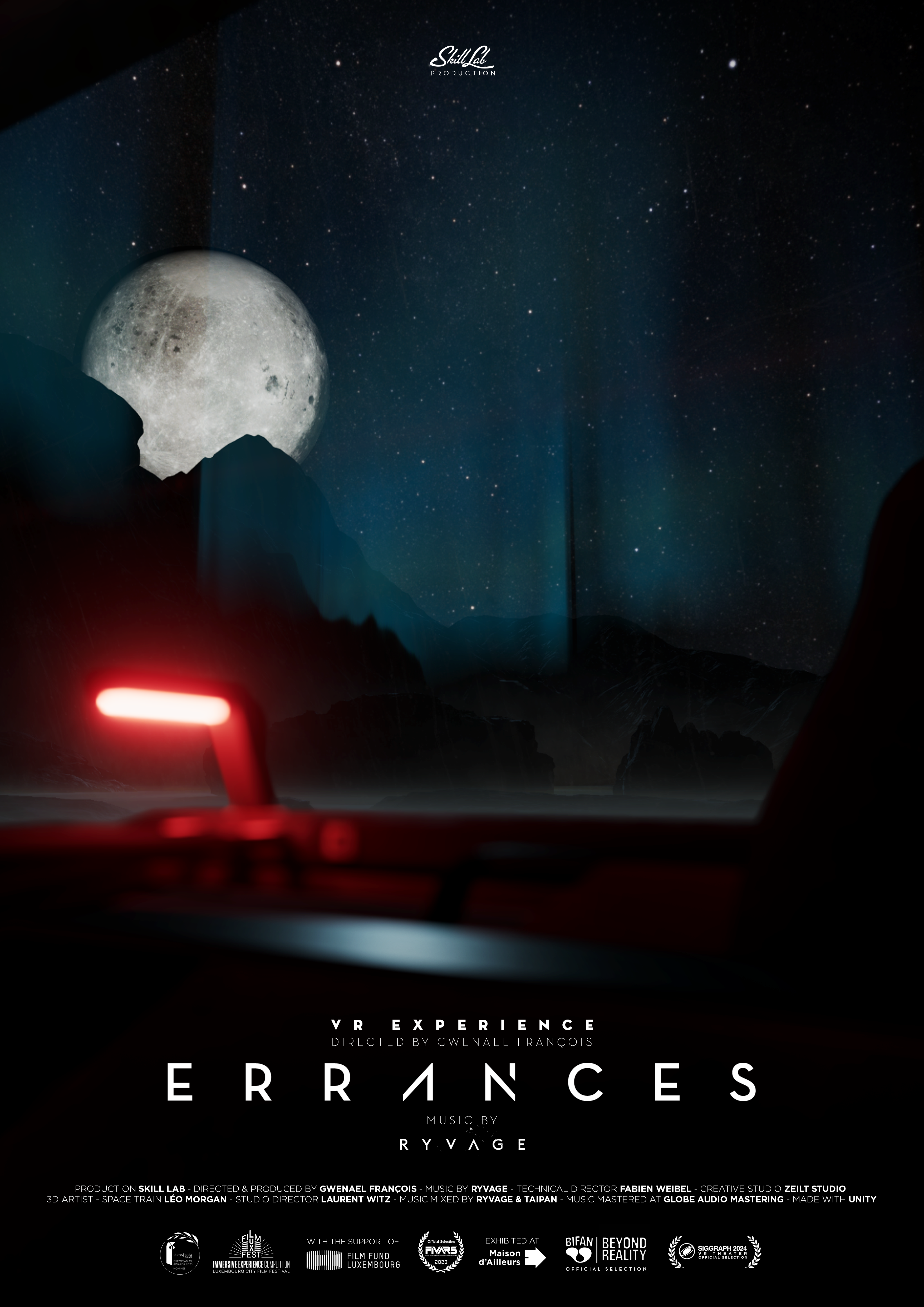 ■ Directed & Produced by Gwenael François ■ Music - Errances – by Ryvage ■ Technical Direction by Fabien Weibel ■ 3D Artist of Space Train Léo Morgan ■ Creative Studio by Zeilt ■ Studio Direction by Laurent Witz ■ 3D Assets by Vitaly Bulgarov, Ximo Catala, Naturemanufacture, Tom Goethals ■ Music mixed by Ryvage & Taipan ■ Music Mastered At Globe Audio Mastering ■ Production by Skill Lab ■ With the support of Film fund Luxembourg ■ Made with unity