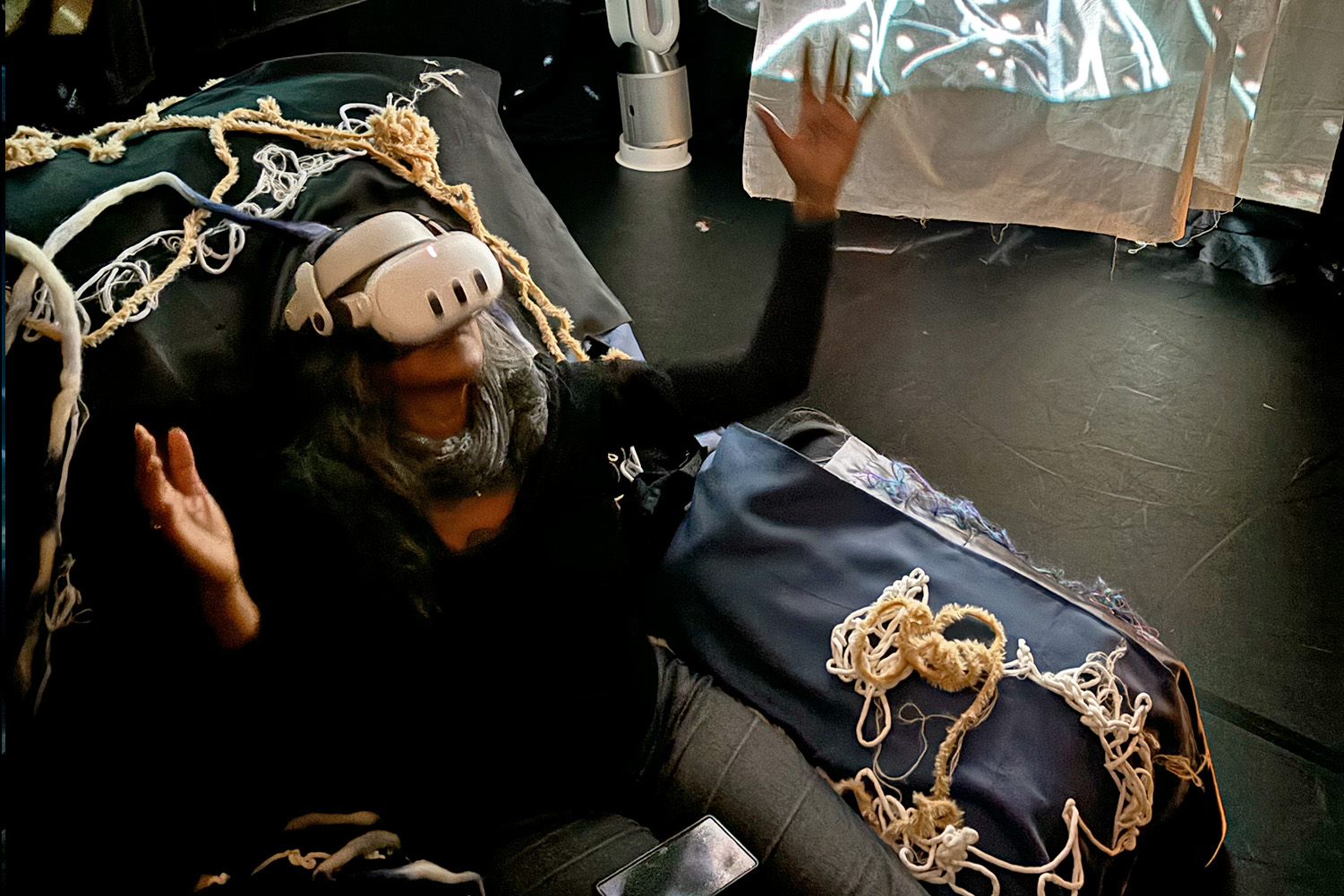 Direction artistique : Katerina R. Stepanova ■ Visuels immersifs : John Desnoyers-Stewart ■ Suspensions Textiles : Shamina Senaratne ■ Expérience matérielle et conception basée sur le corps :: Vasiliki Tsaknaki ■ Conception sonore et Composition : Ruby Singh